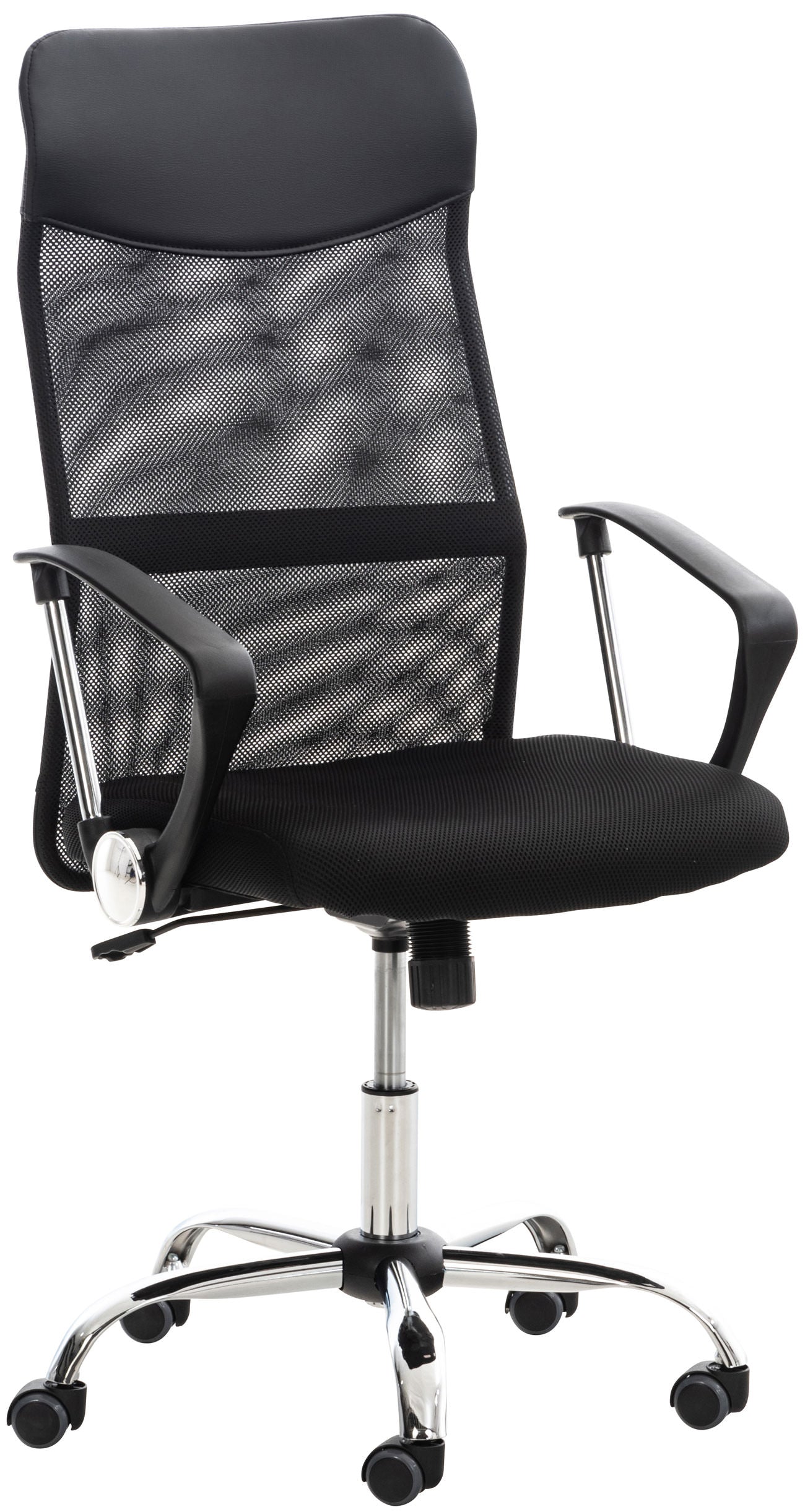 Dieser hochwertige Bürostuhl im schlichten edlen Design ist mit Netzbezug bezogen. Der Bezug ist atmungsaktiv, was gerade bei hohen Temperaturen zum Vorteil werden kann. Dank der verstellbaren Sitzhöhe und den angenehm gepolsterten Armlehnen ist ergonomisches Sitzen garantiert. Die Sitzhöhe ist mit dem Hebel unter dem Sitz stufenlos verstellbar. Das Metallgestell ist verchromt und sehr stabil, für zusätzliche Standsicherheit sorgen die fünf robusten Leichtlaufrollen, mit denen Sie sowohl über Hart- als auch Teppichböden immer leicht und locker rollen können.